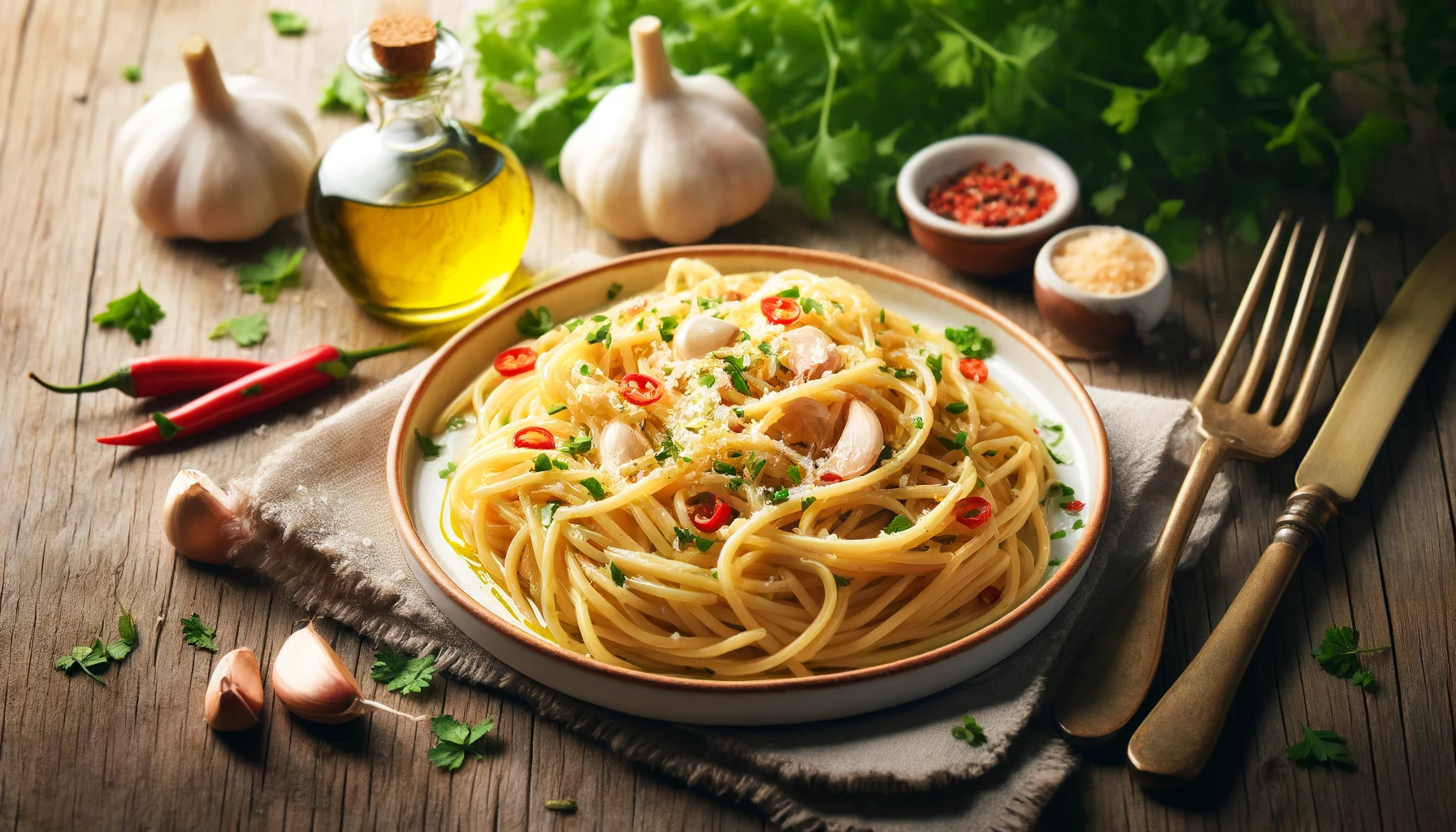 Forestil dig en stor hvid tallerken, hvorpå der ligger en bunke perfekt kogte spaghetti, som skinner let af gylden olivenolie. Små, sprøde skiver af hvidløg ligger spredt over pastaen sammen med små flager af rød chili, der tilføjer et strejf af farve og varme. Over det hele er der drysset friskhakket persille, som giver et grønt og friskt touch til retten. Du kan næsten dufte den aromatiske kombination af hvidløg og olivenolie, der fylder luften. Dette er Spaghetti aglio e olio!